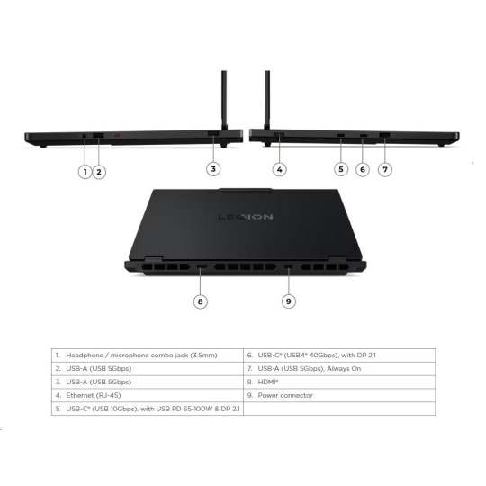 | Standartné porty | 2x USB-A (USB 5Gbps / USB 3.2 Gen 1) 1x USB-A (USB 5Gbps / USB 3.2 Gen 1), Always On 1x USB-C® (USB 10Gbps / USB 3.2 Gen 2), with USB PD 65-100W and DisplayPort™ 2.1 1x USB-C® (USB4® 40Gbps), with DP 2.1 1x HDMI® 2.1, up to 8K/60Hz 1x Headphone / microphone combo jack (3.5mm) 1x Ethernet (RJ-45) 1x Power connector |