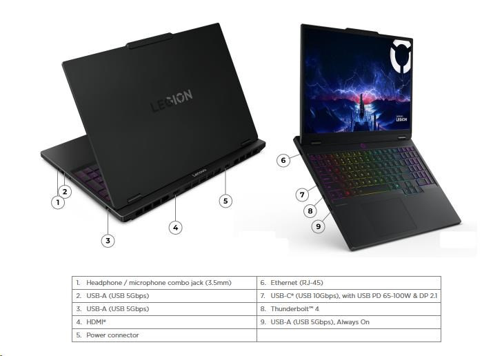 | Standartné porty | 2x USB-A (USB 5Gbps / USB 3.2 Gen 1) 1x USB-A (USB 5Gbps / USB 3.2 Gen 1), Always On 1x USB-C® (USB 10Gbps / USB 3.2 Gen 2), with USB PD 65-100W and DisplayPort™ 2.1 1x USB-C® (Thunderbolt™ 4 / USB4® 40Gbps), with DisplayPort™ 2.1 1x HDMI® 2.1, up to 8K/60Hz 1x Headphone / microphone combo jack (3.5mm) 1x Ethernet (RJ-45) 1x Power connector |