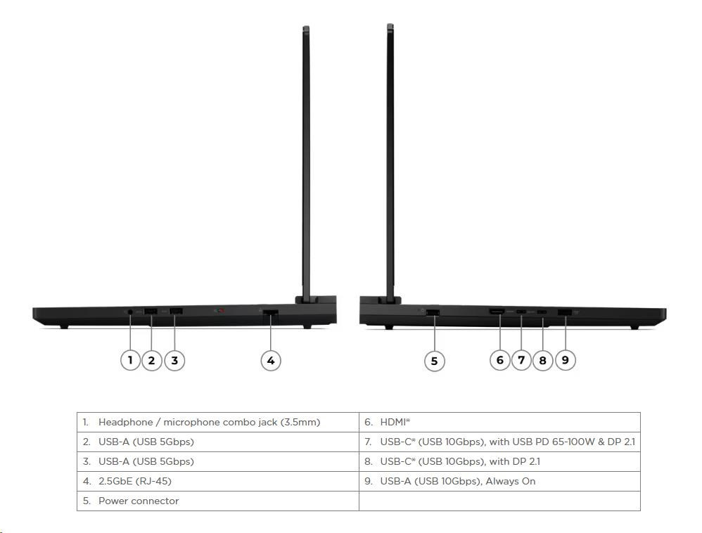 Standartné porty | 2x USB-A (USB 5Gbps / USB 3.2 Gen 1) 1x USB-A (USB 10Gbps / USB 3.2 Gen 2), Always On 1x USB-C® (USB 10Gbps / USB 3.2 Gen 2), with DisplayPort™ 2.1 1x USB-C® (USB 10Gbps / USB 3.2 Gen 2), with USB PD 65-100W and DisplayPort™ 2.1 1x HDMI® 2.1, up to 8K/60Hz 1x Headphone / microphone combo jack (3.5mm) 1x Ethernet (2.5GbE RJ-45) 1x Power connector |