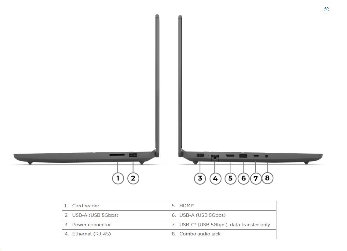 | Standartné porty | 2x USB-A (USB 5Gbps / USB 3.2 Gen 1) 1x USB-C® (USB 5Gbps / USB 3.2 Gen 1), data transfer only 1x HDMI® 2.1, up to 8K/60Hz 1x Headphone / microphone combo jack (3.5mm) 1x Ethernet (RJ-45) 1x Card reader 1x Power connector |
