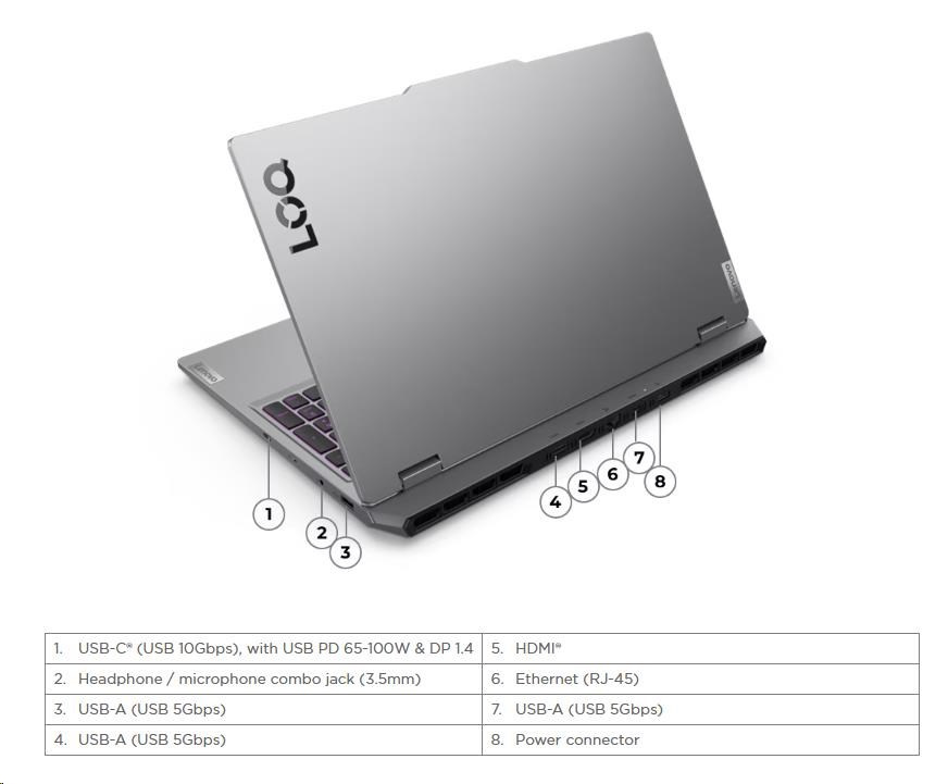 | Standartné porty | 3x USB-A (USB 5Gbps / USB 3.2 Gen 1) 1x USB-C® (USB 10Gbps / USB 3.2 Gen 2), with USB PD 65-100W and DisplayPort™ 1.4 1x HDMI® 2.1, up to 8K/60Hz 1x Headphone / microphone combo jack (3.5mm) 1x Ethernet (RJ-45) 1x Power connector |