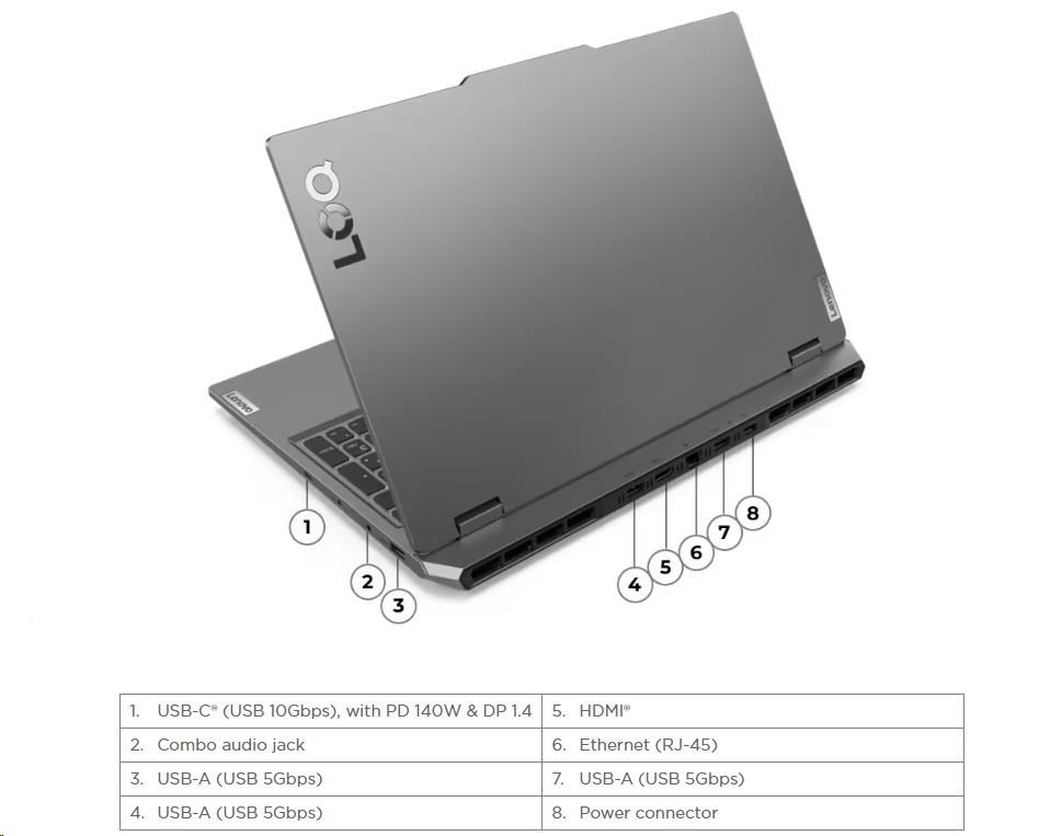 | Standartné porty | 3x USB-A (USB 5Gbps / USB 3.2 Gen 1) 1x USB-C® (USB 10Gbps / USB 3.2 Gen 2), with Lenovo® PD 140W and DisplayPort™ 1.4 1x HDMI® 2.1, up to 8K/60Hz 1x Headphone / microphone combo jack (3.5mm) 1x Ethernet (RJ-45) 1x Power connector |