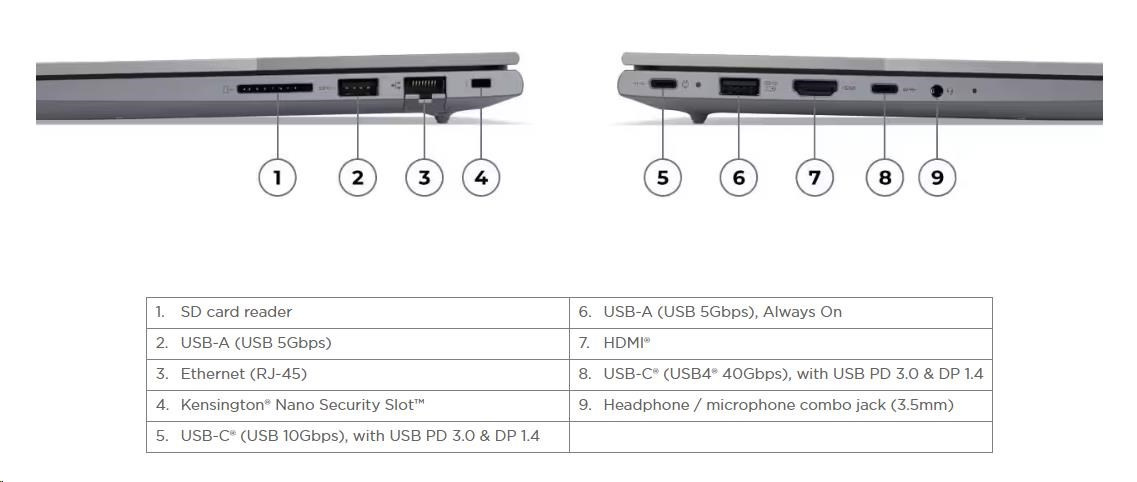 | Standartné porty | 1x USB-A (USB 5Gbps / USB 3.2 Gen 1) 1x USB-A (USB 5Gbps / USB 3.2 Gen 1), Always On 1x USB-C® (USB 10Gbps / USB 3.2 Gen 2), with USB PD 3.0 and DisplayPort™ 1.4 1x USB-C® (USB4® 40Gbps), with USB PD 3.0 and DisplayPort™ 1.4 1x HDMI® 2.1, up to 4K/60Hz 1x Headphone / microphone combo jack (3.5mm) 1x Ethernet (RJ-45) 1x SD card reader |