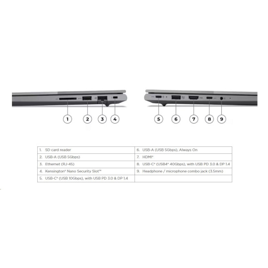 | Standartné porty | 1x USB-A (USB 5Gbps / USB 3.2 Gen 1) 1x USB-A (USB 5Gbps / USB 3.2 Gen 1), Always On 1x USB-C® (USB 10Gbps / USB 3.2 Gen 2), with USB PD 3.0 and DisplayPort™ 1.4 1x USB-C® (USB4® 40Gbps), with USB PD 3.0 and DisplayPort™ 1.4 1x HDMI® 2.1, up to 4K/60Hz 1x Headphone / microphone combo jack (3.5mm) 1x Ethernet (RJ-45) 1x SD card reader |