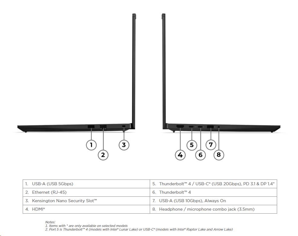 | Standartné porty | 1x USB-A (USB 5Gbps / USB 3.2 Gen 1) 1x USB-A (USB 10Gbps / USB 3.2 Gen 2), Always On 1x USB-C® (Thunderbolt™ 4 / USB4® 40Gbps), with USB PD 45-65W and DisplayPort™ 2.1 1x HDMI® 2.1, up to 4K/60Hz 1x Headphone / microphone combo jack (3.5mm) 1x Ethernet (RJ-45) Optional Ports (configured) 1x USB-C® (Thunderbolt™ 4 / USB4® 40Gbps), with USB PD 45-65W and DisplayPort™ 2.1 |