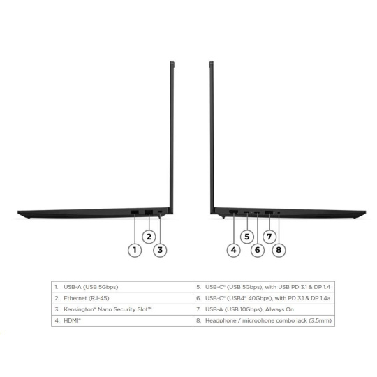 | Standartné porty | 1x USB-A (USB 5Gbps / USB 3.2 Gen 1) 1x USB-A (USB 10Gbps / USB 3.2 Gen 2), Always On 1x USB-C® (USB 5Gbps / USB 3.2 Gen 1), with USB PD 3.1 and DisplayPort™ 1.4 1x USB-C® (USB4® 40Gbps), with USB PD 3.1 and DisplayPort™ 1.4a 1x HDMI® 2.1, up to 4K/60Hz 1x Headphone / microphone combo jack (3.5mm) 1x Ethernet (RJ-45) |
