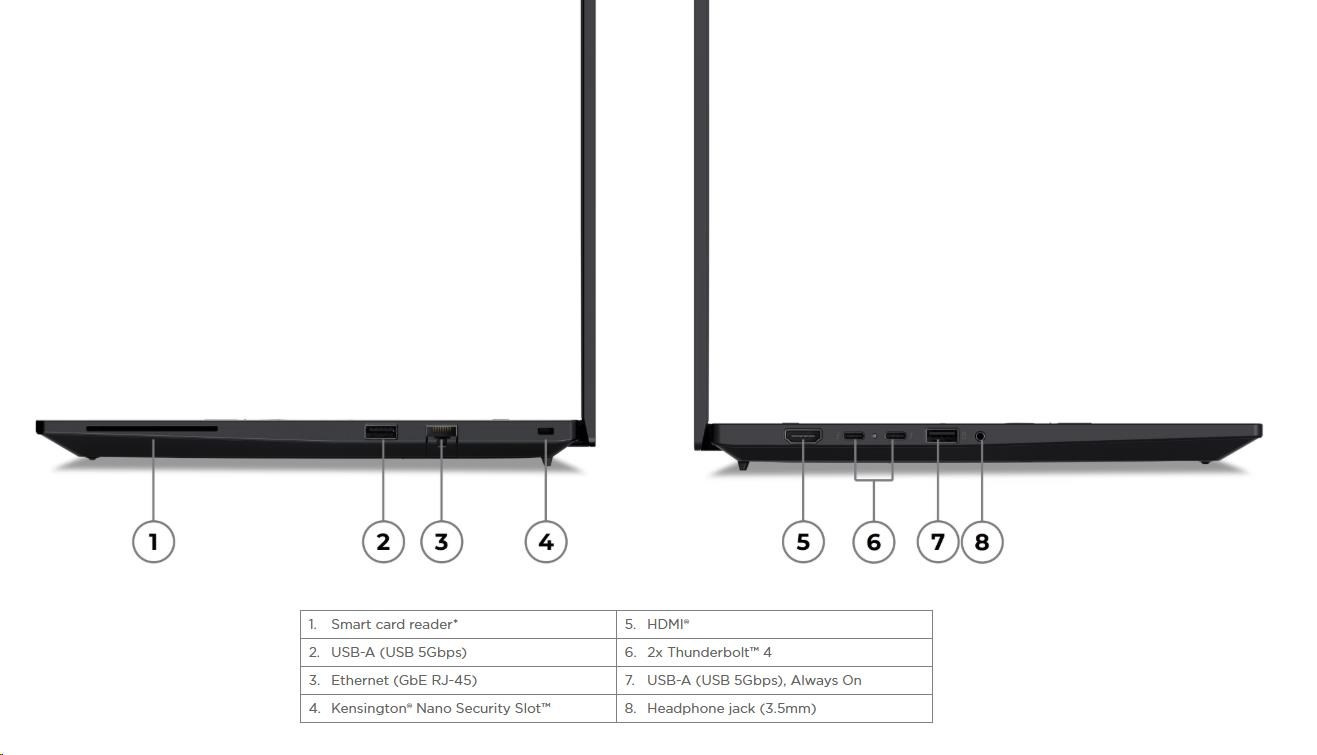| Standartné porty | 1x USB-A (USB 5Gbps / USB 3.2 Gen 1) 1x USB-A (USB 5Gbps / USB 3.2 Gen 1), Always On 2x Thunderbolt™ 4, with USB PD 3.0 1x HDMI® 2.1, up to 4K/60Hz 1x Headphone / microphone combo jack (3.5mm) 1x Ethernet (GbE RJ-45) 1x Security keyhole 1x Smart Card Reader |