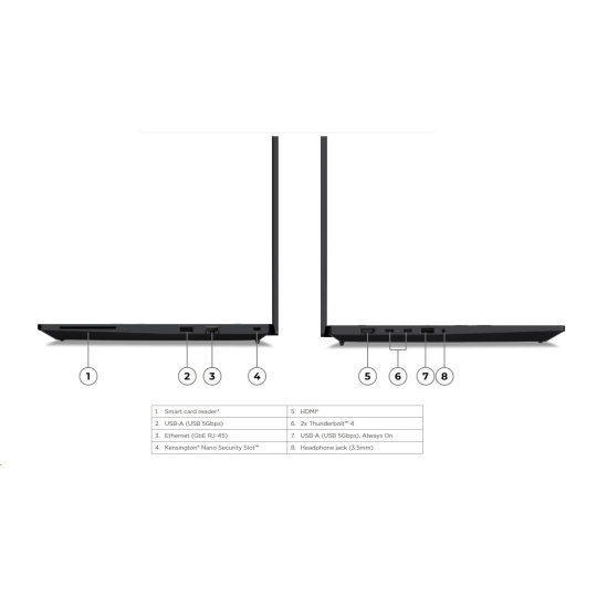 | Standartné porty | 1x USB-A (USB 5Gbps / USB 3.2 Gen 1) 1x USB-A (USB 5Gbps / USB 3.2 Gen 1), Always On 2x Thunderbolt™ 4, with USB PD 3.0 1x HDMI® 2.1, up to 4K/60Hz 1x Headphone / microphone combo jack (3.5mm) 1x Ethernet (GbE RJ-45) 1x Security keyhole 1x Smart Card Reader |
