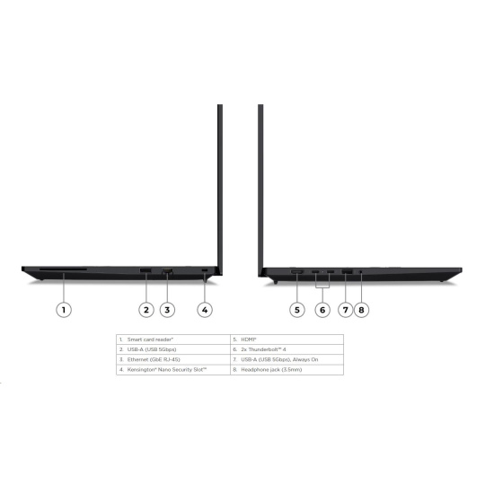 | Standartné porty | 1x USB-A (USB 5Gbps / USB 3.2 Gen 1) 1x USB-A (USB 5Gbps / USB 3.2 Gen 1), Always On 2x Thunderbolt™ 4, with USB PD 3.0 1x HDMI® 2.1, up to 4K/60Hz 1x Headphone / microphone combo jack (3.5mm) 1x Ethernet (GbE RJ-45) 1x Security keyhole 1x Smart Card Reader |