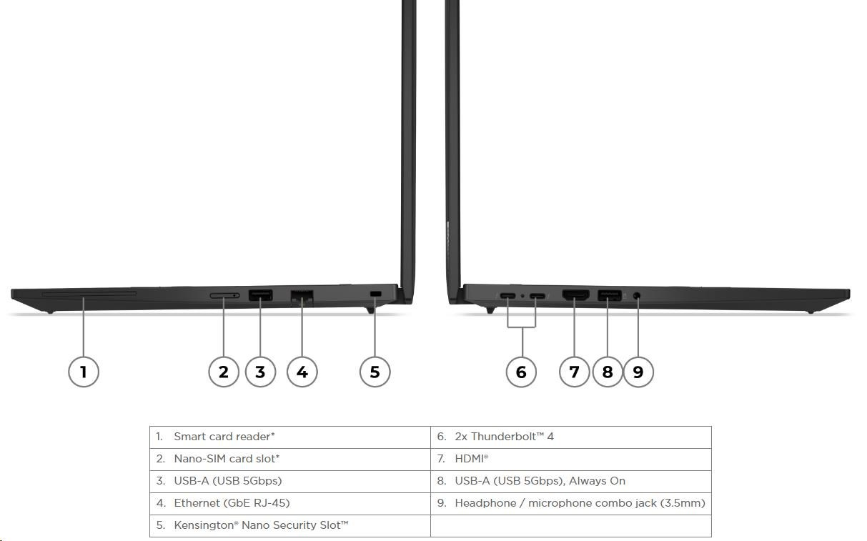 Standartné porty | 1x USB-A (USB 5Gbps / USB 3.2 Gen 1) 1x USB-A (USB 5Gbps / USB 3.2 Gen 1), Always On 2x USB-C® (Thunderbolt™ 4 / USB4® 40Gbps), with USB PD 3.0 and DisplayPort™ 1.4 1x HDMI® 2.1, up to 4K/60Hz 1x Headphone / microphone combo jack (3.5mm) 1x Ethernet (RJ-45) 1x Security keyhole |
