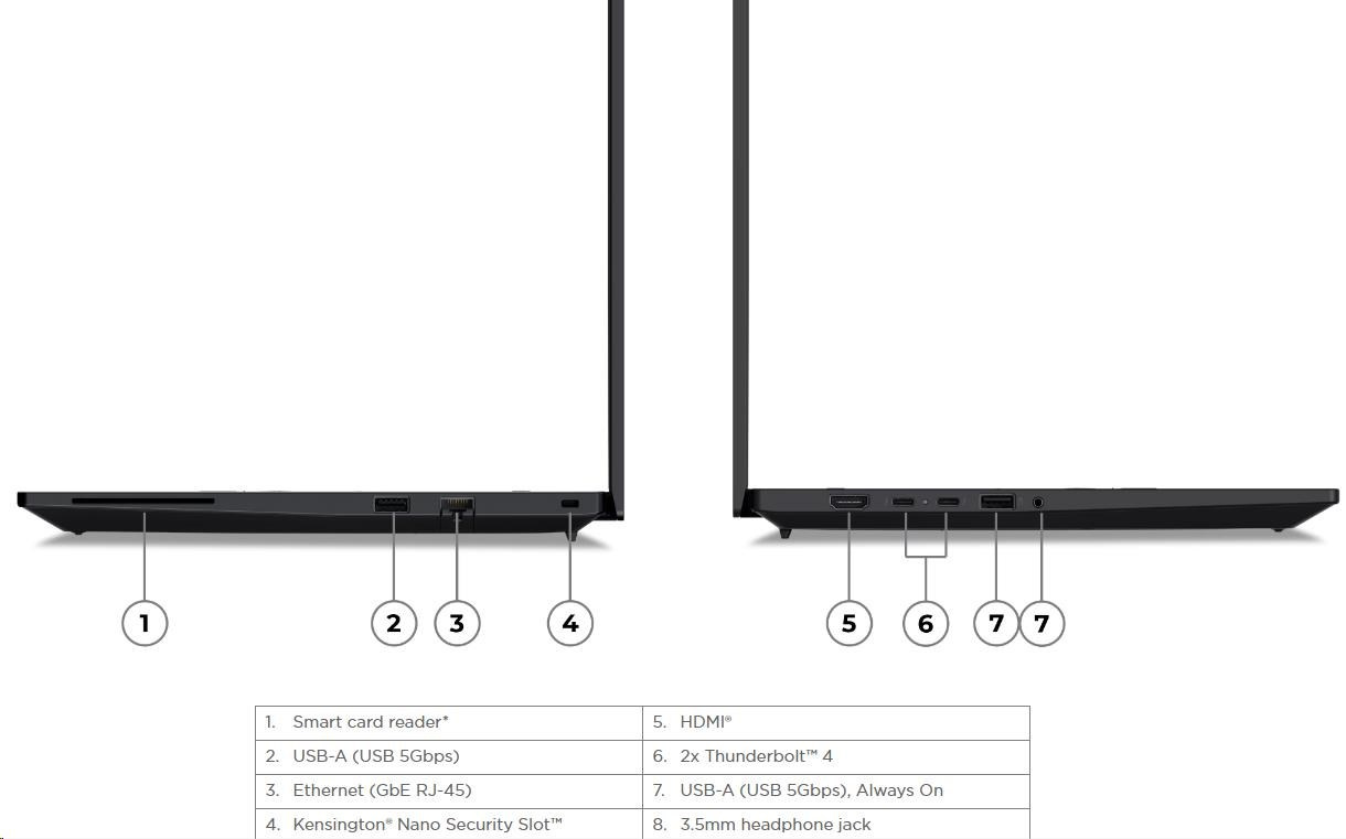| Standartné porty | 1x USB-A (USB 5Gbps / USB 3.2 Gen 1) 1x USB-A (USB 5Gbps / USB 3.2 Gen 1), Always On 2x USB-C® (Thunderbolt™ 4 / USB4® 40Gbps), with USB PD 3.0 and DisplayPort™ 2.1 1x HDMI® 2.1, up to 4K/60Hz 1x Headphone / microphone combo jack (3.5mm) 1x Ethernet (RJ-45) 1x Security keyhole |