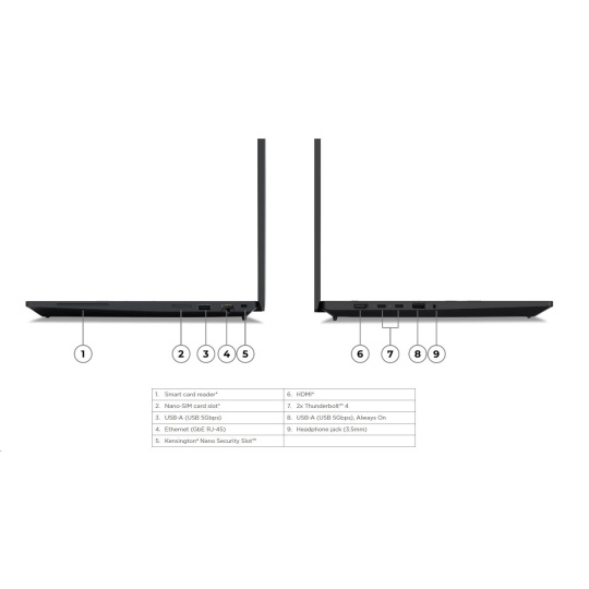| Standartné porty | 1x USB-A (USB 5Gbps / USB 3.2 Gen 1) 1x USB-A (USB 5Gbps / USB 3.2 Gen 1), Always On 2x Thunderbolt™ 4, with USB PD 3.0 1x HDMI® 2.1, up to 4K/60Hz 1x Headphone / microphone combo jack (3.5mm) 1x Ethernet (GbE RJ-45) 1x Security keyhole 1x Smart Card Reader |