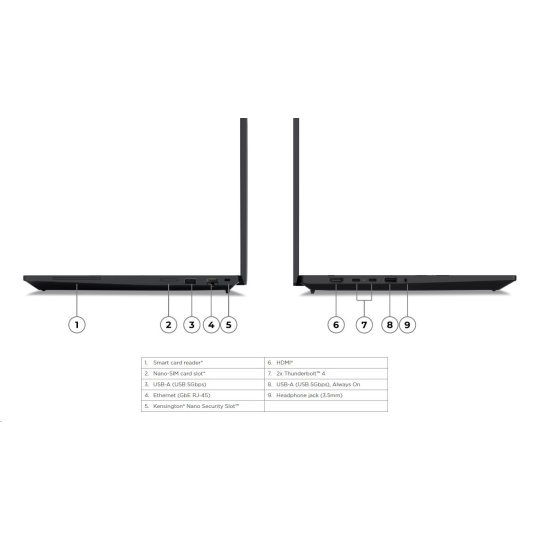 | Standartné porty | 1x USB-A (USB 5Gbps / USB 3.2 Gen 1) 1x USB-A (USB 5Gbps / USB 3.2 Gen 1), Always On 2x Thunderbolt™ 4, with USB PD 3.0 1x HDMI® 2.1, up to 4K/60Hz 1x Headphone / microphone combo jack (3.5mm) 1x Ethernet (GbE RJ-45) 1x Security keyhole 1x Smart Card Reader 1x Nano-SIM Card Slot |