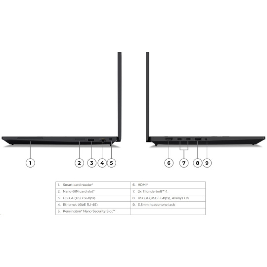 | Standartné porty | 1x USB-A (USB 5Gbps / USB 3.2 Gen 1) 1x USB-A (USB 5Gbps / USB 3.2 Gen 1), Always On 2x USB-C® (Thunderbolt™ 4 / USB4® 40Gbps), with USB PD 3.0 and DisplayPort™ 2.1 1x HDMI® 2.1, up to 4K/60Hz 1x Headphone / microphone combo jack (3.5mm) 1x Ethernet (RJ-45) 1x Security keyhole |