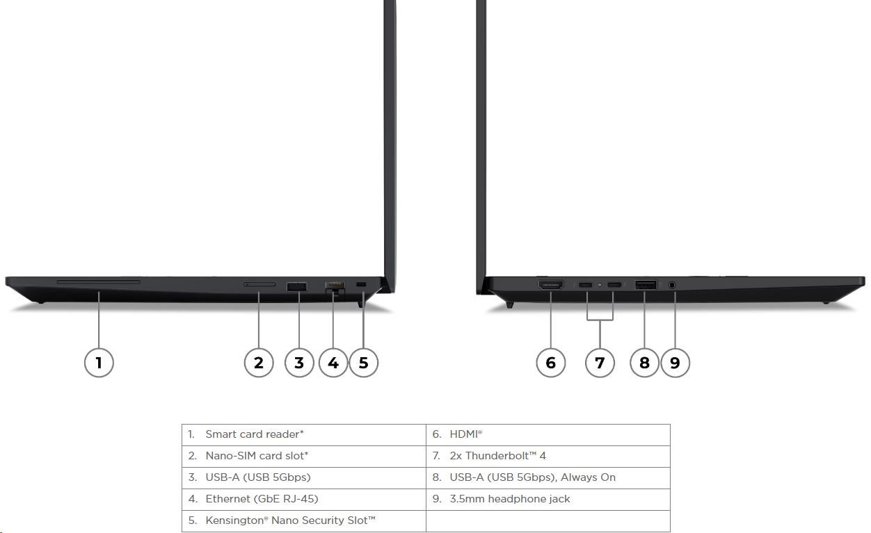 | Standartné porty | 1x USB-A (USB 5Gbps / USB 3.2 Gen 1) 1x USB-A (USB 5Gbps / USB 3.2 Gen 1), Always On 2x USB-C® (Thunderbolt™ 4 / USB4® 40Gbps), with USB PD 3.0 and DisplayPort™ 2.1 1x HDMI® 2.1, up to 4K/60Hz 1x Headphone / microphone combo jack (3.5mm) 1x Ethernet (RJ-45) 1x Security keyhole |