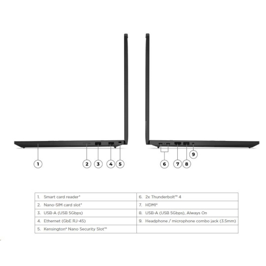 | Standartné porty | 1x USB-A (USB 5Gbps / USB 3.2 Gen 1) 1x USB-A (USB 5Gbps / USB 3.2 Gen 1), Always On 2x USB-C® (Thunderbolt™ 4 / USB4® 40Gbps), with PD 3.0 and DisplayPort™ 1.4 1x HDMI® 2.1, up to 4K/60Hz 1x Headphone / microphone combo jack (3.5mm) 1x Ethernet (RJ-45) 1x Security keyhole |
