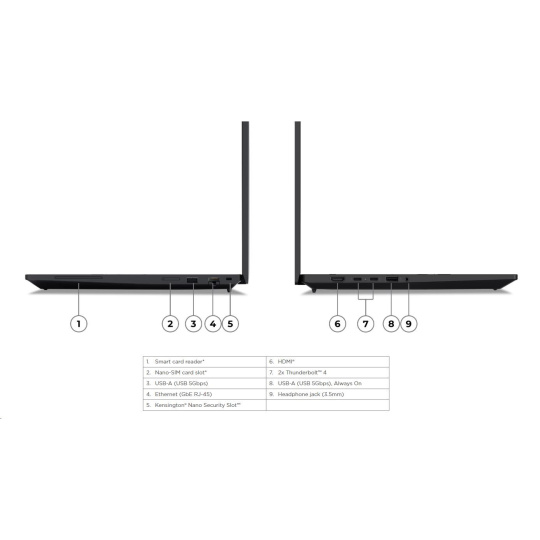 | Standartné porty | 1x USB-A (USB 5Gbps / USB 3.2 Gen 1) 1x USB-A (USB 5Gbps / USB 3.2 Gen 1), Always On 2x Thunderbolt™ 4, with USB PD 3.0 1x HDMI® 2.1, up to 4K/60Hz 1x Headphone / microphone combo jack (3.5mm) 1x Ethernet (GbE RJ-45) 1x Security keyhole |