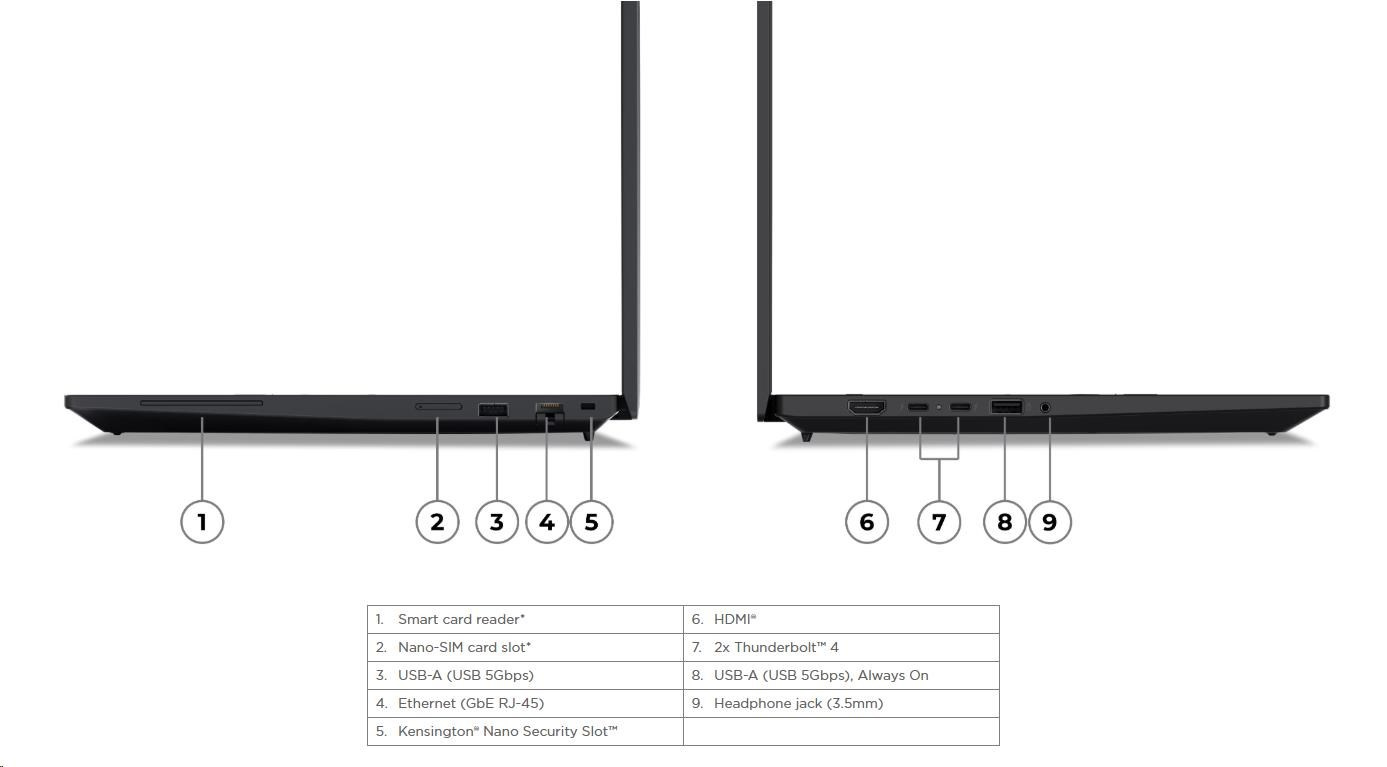 | Standartné porty | 1x USB-A (USB 5Gbps / USB 3.2 Gen 1) 1x USB-A (USB 5Gbps / USB 3.2 Gen 1), Always On 2x Thunderbolt™ 4, with USB PD 3.0 1x HDMI® 2.1, up to 4K/60Hz 1x Headphone / microphone combo jack (3.5mm) 1x Ethernet (GbE RJ-45) 1x Security keyhole |