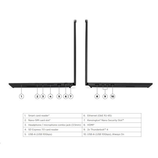 | Standartné porty | 1x USB-A (USB 10Gbps / USB 3.2 Gen 2), Always On 1x USB-A (USB 10Gbps / USB 3.2 Gen 2) 2x Thunderbolt™ 4, with USB PD 3.1, 140W input / 15W output 1x HDMI® 2.1, up to 8K/60Hz 1x Headphone / microphone combo jack (3.5mm) 1x Ethernet (GbE RJ-45) 1x SD Express 7.0 card reader 1x Security keyhole |