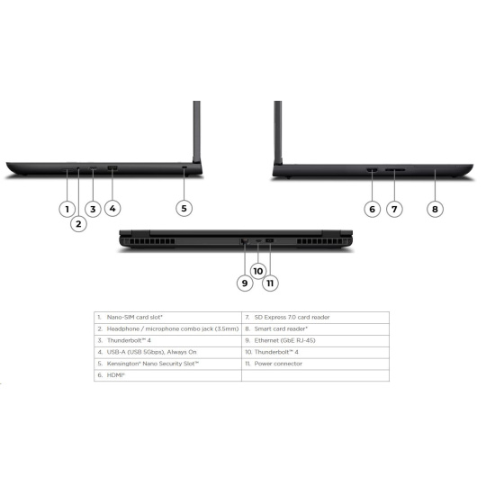 | Standartné porty | 1x USB-A (USB 5Gbps / USB 3.2 Gen 1), Always On 2x USB-C® (Thunderbolt™ 4 / USB4® 40Gbps), with USB PD 3.0 and DisplayPort™ 2.1 1x HDMI® 2.1, up to 8K/60Hz 1x Headphone / microphone combo jack (3.5mm) 1x Ethernet (RJ-45) 1x SD Express 7.0 card reader 1x Security keyhole |