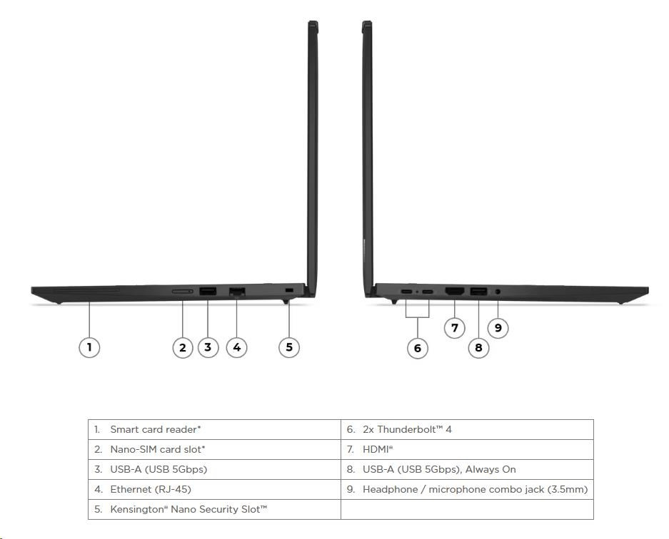| Standartné porty | 1x USB-A (USB 5Gbps / USB 3.2 Gen 1) 1x USB-A (USB 5Gbps / USB 3.2 Gen 1), Always On 2x USB-C® (Thunderbolt™ 4 / USB4® 40Gbps), with USB PD 3.0 and DisplayPort™ 2.1 1x HDMI® 2.1, up to 4K/60Hz 1x Headphone / microphone combo jack (3.5mm) 1x Ethernet (RJ-45) 1x Smart Card Reader 1x Nano-SIM Card Slot |