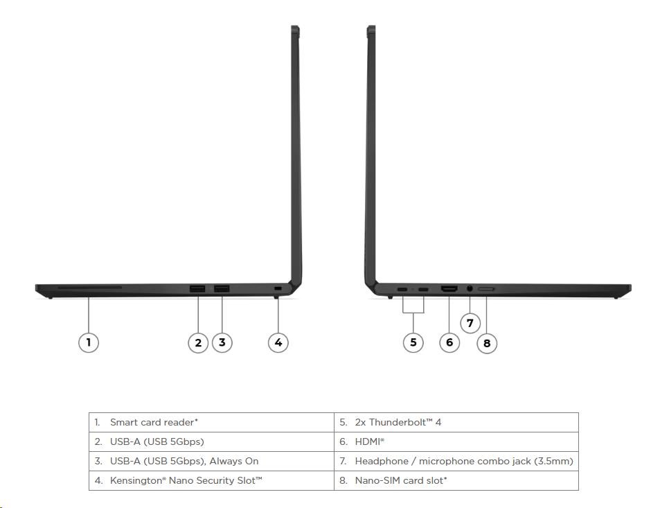 | Standartné porty | 1x USB-A (USB 5Gbps / USB 3.2 Gen 1) 1x USB-A (USB 5Gbps / USB 3.2 Gen 1), Always On 2x USB-C® (Thunderbolt™ 4 / USB4® 40Gbps), with USB PD 3.0 and DisplayPort™ 2.1 1x HDMI® 2.1, up to 4K/60Hz 1x Headphone / microphone combo jack (3.5mm) 1x Smart Card Reader 1x Nano-SIM Card Slot |