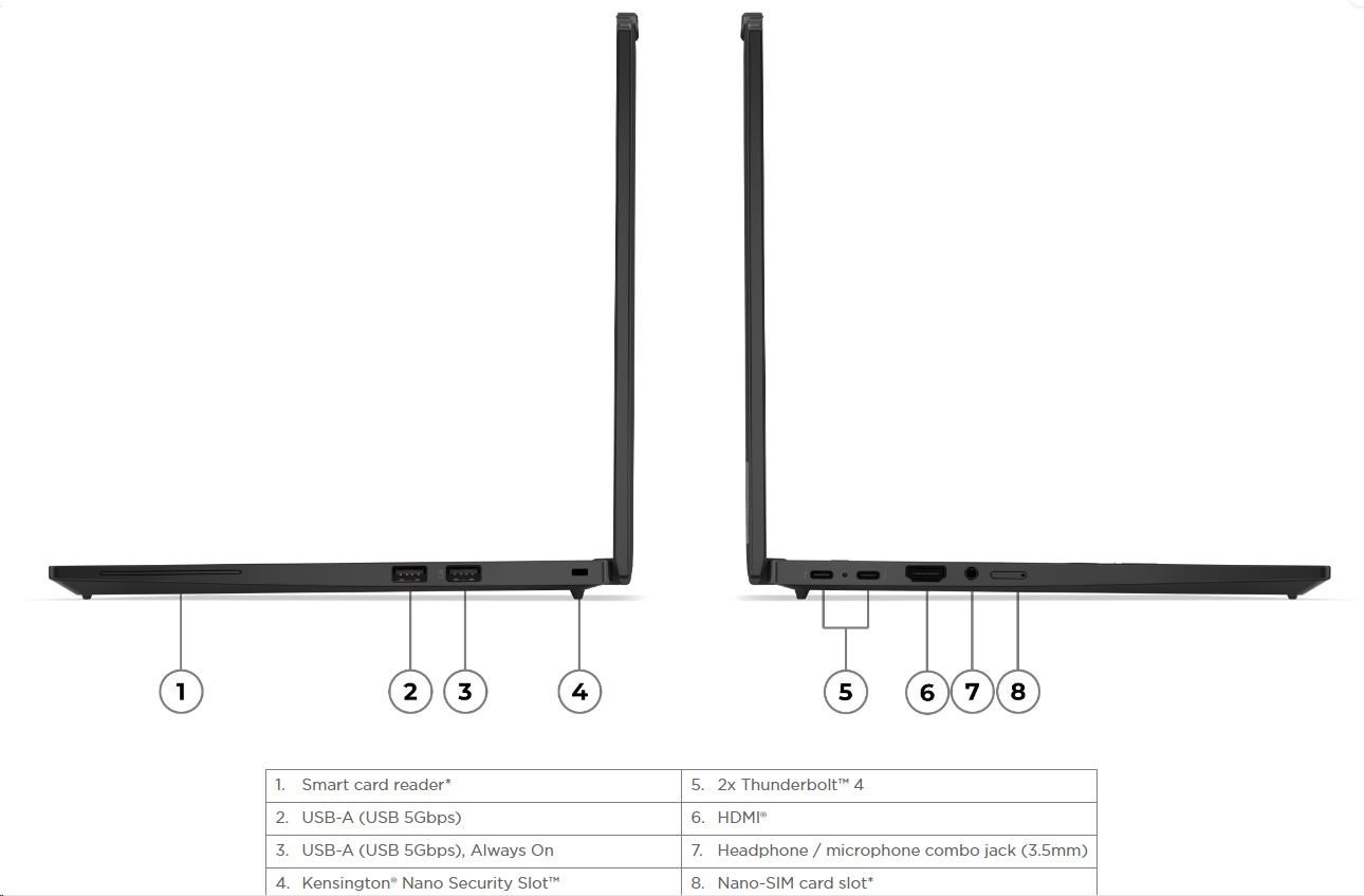 | Standartné porty | 1x USB-A (USB 5Gbps / USB 3.2 Gen 1) 1x USB-A (USB 5Gbps / USB 3.2 Gen 1), Always On 2x USB-C® (Thunderbolt™ 4 / USB4® 40Gbps), with USB PD 3.0 and DisplayPort™ 2.1 1x HDMI® 2.1, up to 4K/60Hz 1x Headphone / microphone combo jack (3.5mm) |