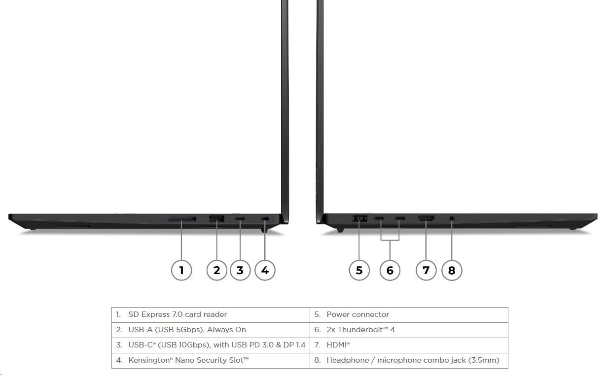 | Standartné porty | 1x USB-A (USB 5Gbps / USB 3.2 Gen 1), Always On 1x USB-C® (USB 10Gbps / USB 3.2 Gen 2), with USB PD 3.0 (135W input) and DisplayPort™ 1.4 2x USB-C® (Thunderbolt™ 4 / USB4® 40Gbps), with USB PD 3.0 (135W input) and DisplayPort™ 2.1 1x HDMI® 2.1, up to 8K/60Hz 1x Headphone / microphone combo jack (3.5mm) 1x SD Express 7.0 card reader 1x Security keyhole |