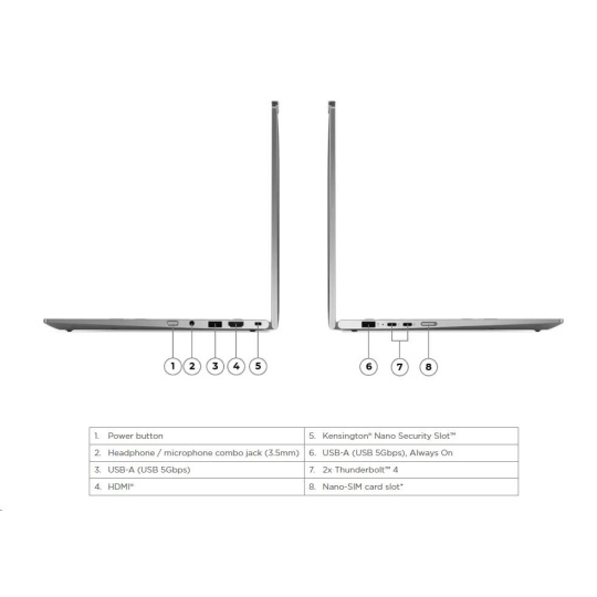 | Standartné porty | 1x USB-A (USB 5Gbps / USB 3.2 Gen 1) 1x USB-A (USB 5Gbps / USB 3.2 Gen 1), Always On 2x USB-C® (Thunderbolt™ 4 / USB4® 40Gbps), with USB PD 3.0 and DisplayPort™ 2.1 1x HDMI® 2.1, up to 4K/60Hz 1x Headphone / microphone combo jack (3.5mm) 1x Nano-SIM Card Slot  |