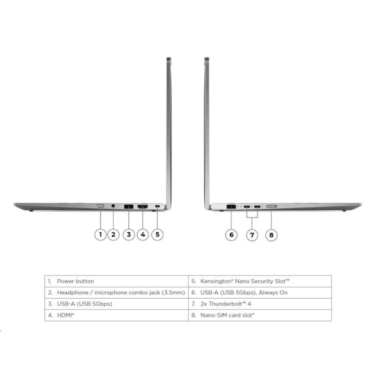 | Standartné porty | 1x USB-A (USB 5Gbps / USB 3.2 Gen 1) 1x USB-A (USB 5Gbps / USB 3.2 Gen 1), Always On 2x USB-C® (Thunderbolt™ 4 / USB4® 40Gbps), with USB PD 3.0 and DisplayPort™ 2.1 1x HDMI® 2.1, up to 4K/60Hz 1x Headphone / microphone combo jack (3.5mm) 1x Nano-SIM Card Slot |