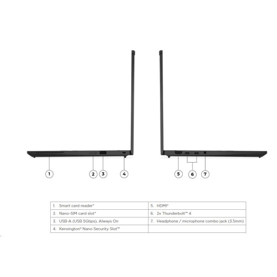 | Standartné porty | 1x USB-A (USB 5Gbps / USB 3.2 Gen 1), Always On 2x USB-C® (Thunderbolt™ 4 / USB4® 40Gbps), with USB PD 3.0 and DisplayPort™ 2.1 1x HDMI® 2.1, up to 4K/60Hz 1x Headphone / microphone combo jack (3.5mm |