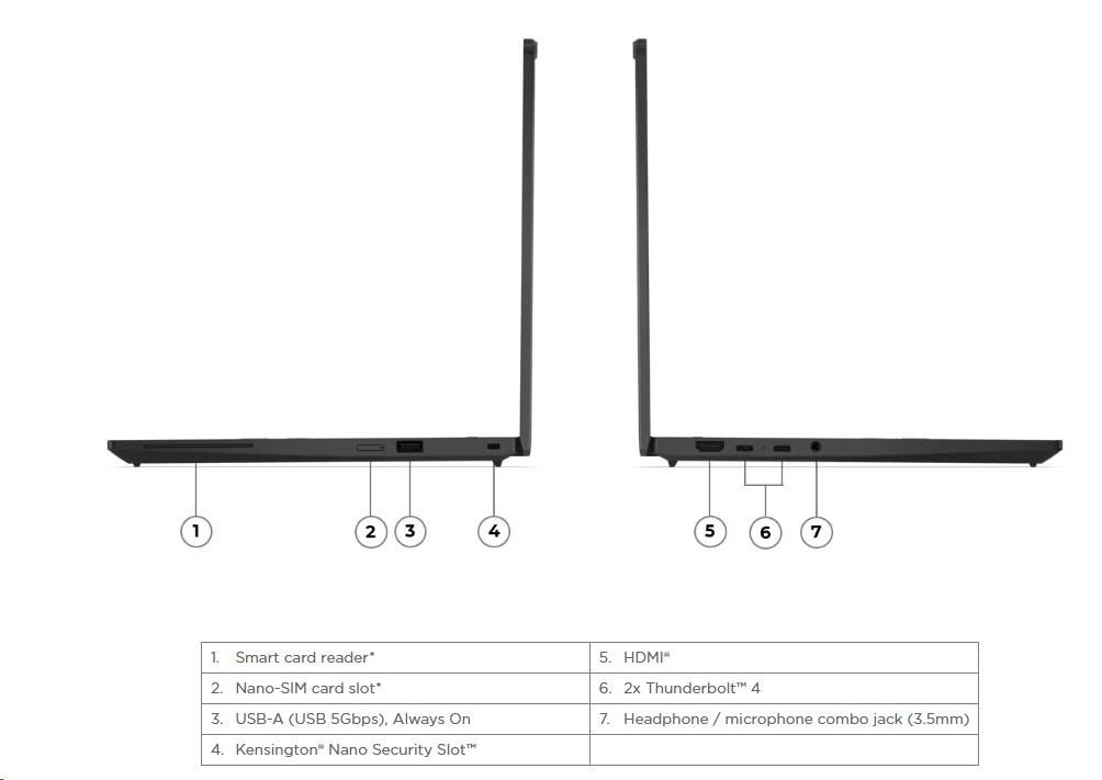 | Standartné porty | 1x USB-A (USB 5Gbps / USB 3.2 Gen 1), Always On 2x USB-C® (Thunderbolt™ 4 / USB4® 40Gbps), with USB PD 3.0 and DisplayPort™ 2.1 1x HDMI® 2.1, up to 4K/60Hz 1x Headphone / microphone combo jack (3.5mm |