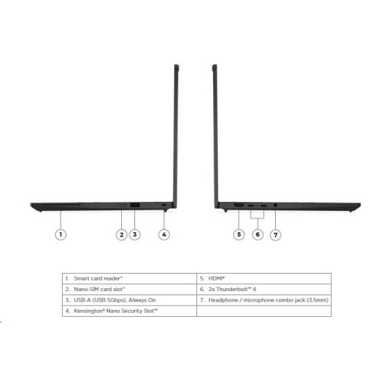| Standartné porty | 1x USB-A (USB 5Gbps / USB 3.2 Gen 1), Always On 2x USB-C® (Thunderbolt™ 4 / USB4® 40Gbps), with USB PD 3.0 and DisplayPort™ 2.1 1x HDMI® 2.1, up to 4K/60Hz 1x Headphone / microphone combo jack (3.5mm) |