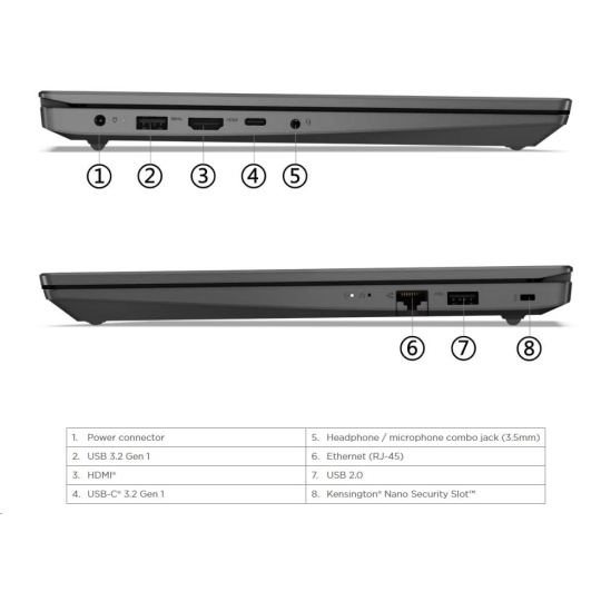 | Standartné porty | 1x USB 2.0 1x USB 3.2 Gen 1 1x USB-C® 3.2 Gen 1 (support data transfer, Power Delivery 3.0 and DisplayPort™ 1.2) 1x HDMI® 1.4b 1x Headphone / microphone combo jack (3.5mm) 1x Ethernet (RJ-45) 1x Power connector |