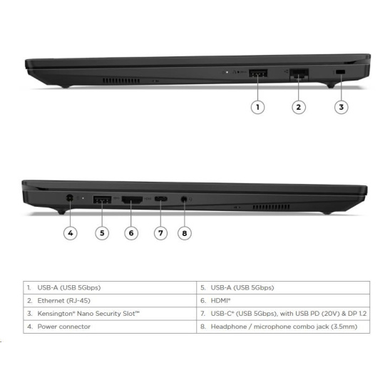 | Štandardné porty | 2x USB-A (USB 5Gbps / USB 3.2 Gen 1) 1x USB-C® (USB 5Gbps / USB 3.2 Gen 1), s USB Power Delivery (len 20V) a DisplayPort™ 1.2 1x HDMI® 1.4b 1x Sluchátkový/mikrofónny kombinovaný konektor (3,5 mm) 1x Ethernet (RJ-45) 1x Napájací konektor |