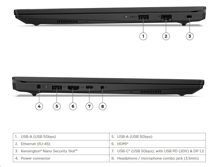 | Štandardné porty | 2x USB-A (USB 5Gbps / USB 3.2 Gen 1) 1x USB-C® (USB 5Gbps / USB 3.2 Gen 1), s USB Power Delivery (len 20V) a DisplayPort™ 1.2 1x HDMI® 1.4b 1x Sluchátkový/mikrofónny kombinovaný konektor (3,5 mm) 1x Ethernet (RJ-45) 1x Napájací konektor |