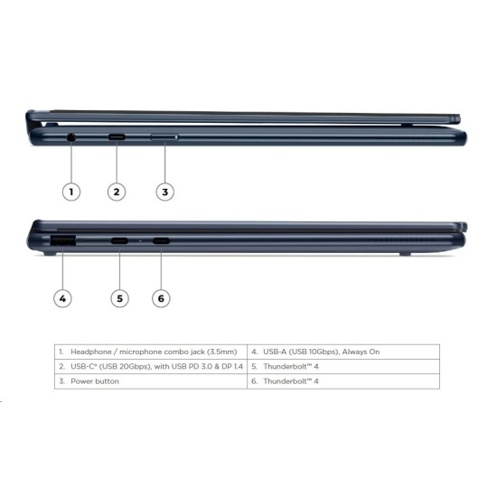 | Standartné porty | 1x USB-A (USB 10Gbps / USB 3.2 Gen 2), Always On 1x USB-C® (USB 20Gbps / USB4® Gen 2x2), with USB PD 3.0 and DisplayPort™ 1.4 2x USB-C® (Thunderbolt™ 4 / USB4® 40Gbps), with USB PD 3.0 and DisplayPort™ 2.1 1x Headphone / microphone combo jack (3.5mm) |