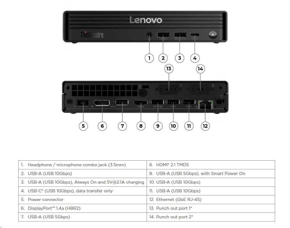 | Predné porty | 1x USB-C® (USB 10Gbps / USB 3.2 Gen 2), data transfer only 2x USB-A (USB 10Gbps / USB 3.2 Gen 2), one supports Always On and 5V@2.1A charging 1x headphone / microphone combo jack (3.5mm) |