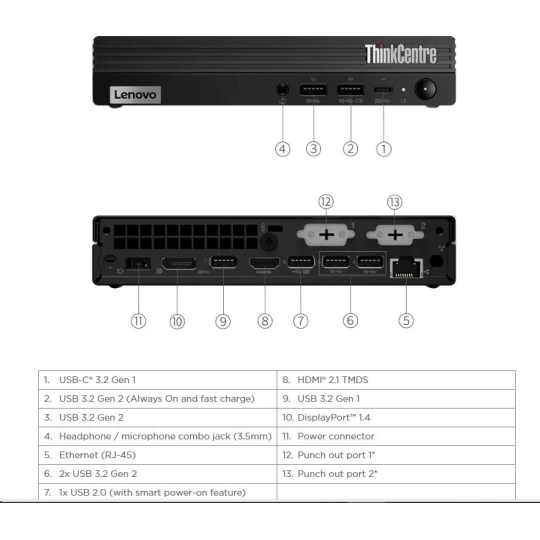 | Predné porty | 1x USB-C® 3.2 Gen 1 (support data transfer and 5V@0.9A charging) 1x USB 3.2 Gen 2 1x USB 3.2 Gen 2 (Always On and 5V@2.1A charging) 1x headphone / microphone combo jack (3.5mm) |