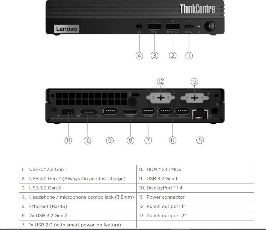 | Predné porty | 1x USB-C® 3.2 Gen 1 (support data transfer and 5V@0.9A charging) 1x USB 3.2 Gen 2 1x USB 3.2 Gen 2 (Always On and 5V@2.1A charging) 1x headphone / microphone combo jack (3.5mm) |