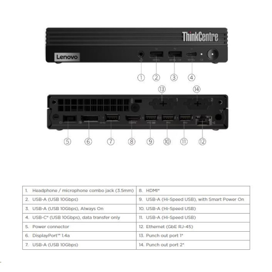 | Predné porty | 1x USB-C® (USB 10Gbps / USB 3.2 Gen 2), data transfer only 1x USB-A (USB 10Gbps / USB 3.2 Gen 2), with Always On and 5V@2.1A charging 1x USB-A (USB 10Gbps / USB 3.2 Gen 2) 1x headphone / microphone combo jack (3.5mm) |