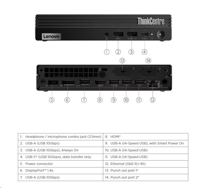 | Predné porty | 1x USB-C® (USB 10Gbps / USB 3.2 Gen 2), data transfer only 1x USB-A (USB 10Gbps / USB 3.2 Gen 2), with Always On and 5V@2.1A charging 1x USB-A (USB 10Gbps / USB 3.2 Gen 2) 1x headphone / microphone combo jack (3.5mm) |