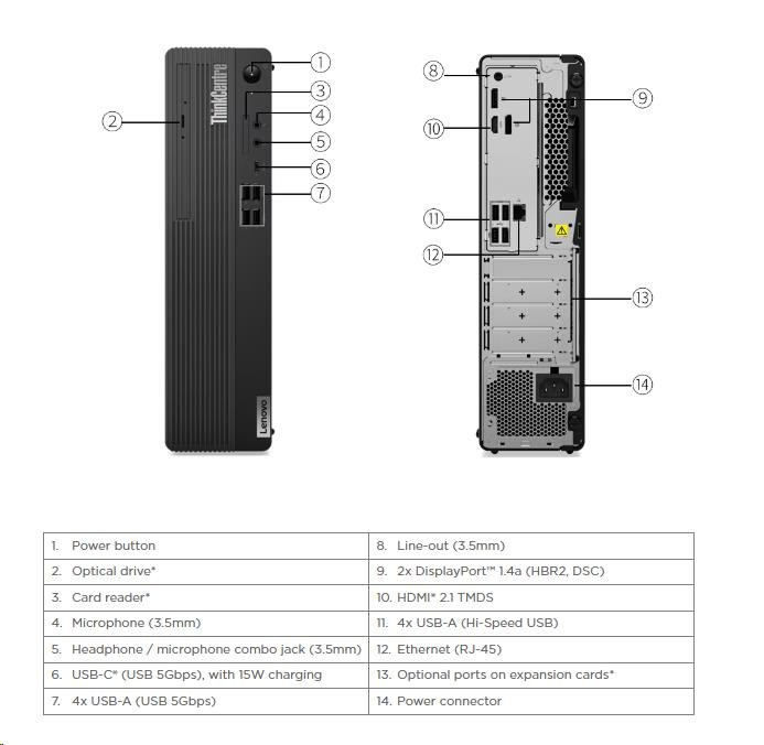 | Predné porty | 1x USB-C® (USB 5Gbps / USB 3.2 Gen 1), with 15W charging 4x USB-A (USB 5Gbps / USB 3.2 Gen 1) 1x headphone (3.5mm) 1x headphone / microphone combo jack (3.5mm) |