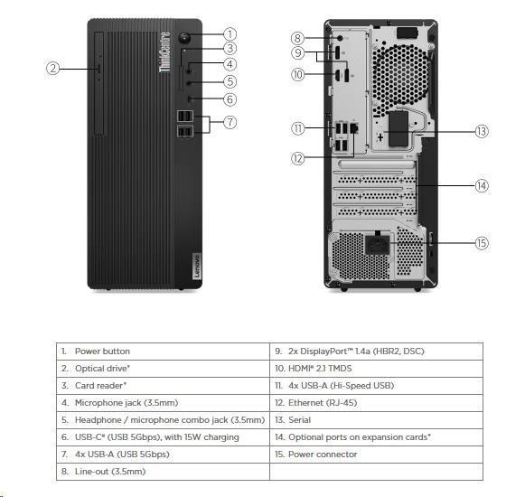 | Predné porty | 1x USB-C® (USB 5Gbps / USB 3.2 Gen 1), with 15W charging 4x USB-A (USB 5Gbps / USB 3.2 Gen 1) 1x headphone / microphone combo jack (3.5mm) 1x microphone (3.5mm) |