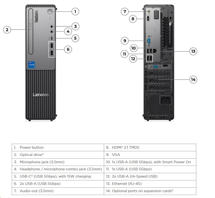 | Zadné porty | 2x USB-A (Hi-Speed USB / USB 2.0) 2x USB-A (USB 5Gbps / USB 3.2 Gen 1), one supports Smart Power On 1x HDMI® 2.1 TMDS 1x VGA 1x Ethernet (RJ-45) 1x line-out (3.5mm) |