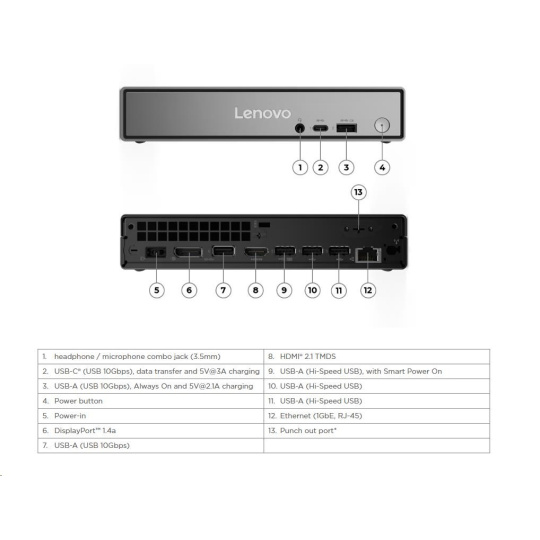 | Predné porty | 1x USB-C® (USB 10Gbps / USB 3.2 Gen 2), with data transfer and 5V@3A charging 1x USB-A (USB 10Gbps / USB 3.2 Gen 2), with Always On and 5V@2.1A charging 1x headphone / microphone combo jack (3.5mm) |
