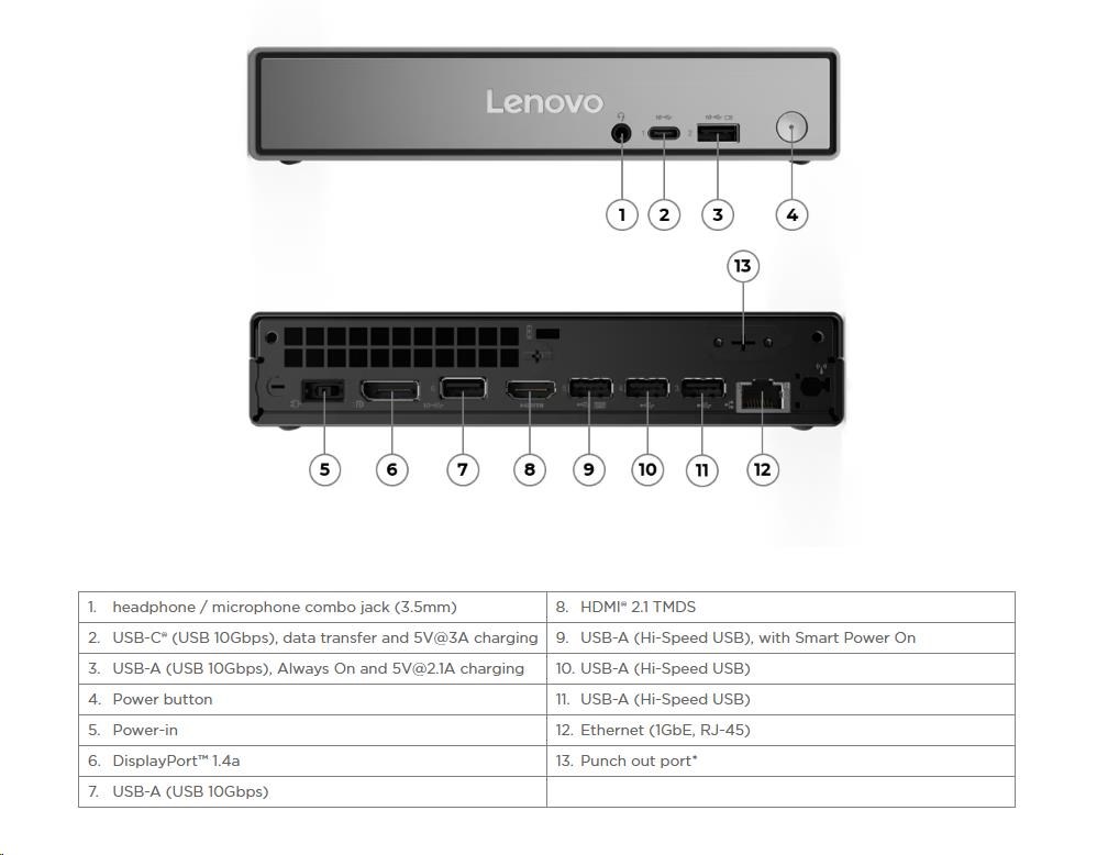 | Predné porty | 1x USB-C® (USB 10Gbps / USB 3.2 Gen 2), with data transfer and 5V@3A charging 1x USB-A (USB 10Gbps / USB 3.2 Gen 2), with Always On and 5V@2.1A charging 1x headphone / microphone combo jack (3.5mm) |