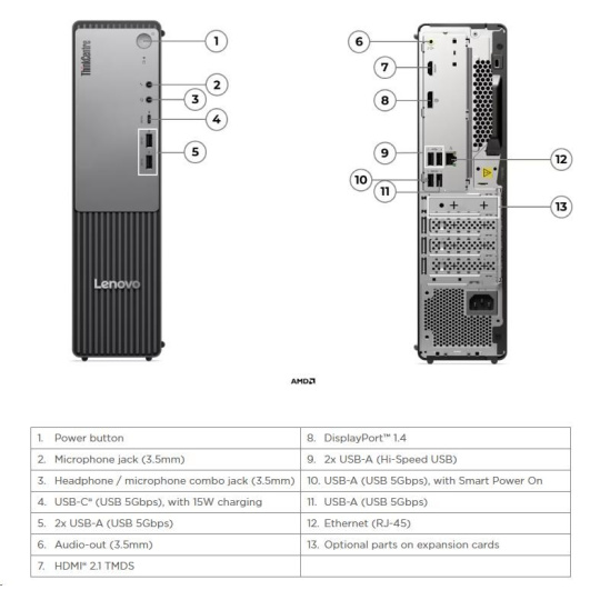 | Zadné porty | 2x USB-A (Hi-Speed USB / USB 2.0) 2x USB-A (USB 5Gbps / USB 3.2 Gen 1), one supports Smart Power On 1x HDMI® 2.1 TMDS 1x DisplayPort™ 1.4 1x Ethernet (RJ-45) 1x line-out (3.5mm) |