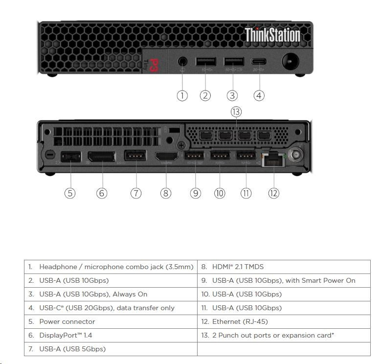 | Zadné porty | 1x USB-A (USB 5Gbps / USB 3.2 Gen 1) 3x USB-A (USB 10Gbps / USB 3.2 Gen 2), one supports Smart Power On 1x HDMI® 2.1 TMDS 1x DisplayPort™ 1.4 1x Ethernet (RJ-45) |