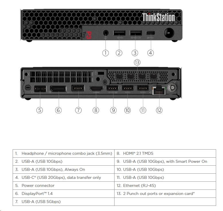 | Predné porty | 1x USB-C® (USB 20Gbps / USB 3.2 Gen 2x2), data transfer only 1x USB-A (USB 10Gbps / USB 3.2 Gen 2), Always On 1x USB-A (USB 10Gbps / USB 3.2 Gen 2) 1x headphone / microphone combo jack (3.5mm) |